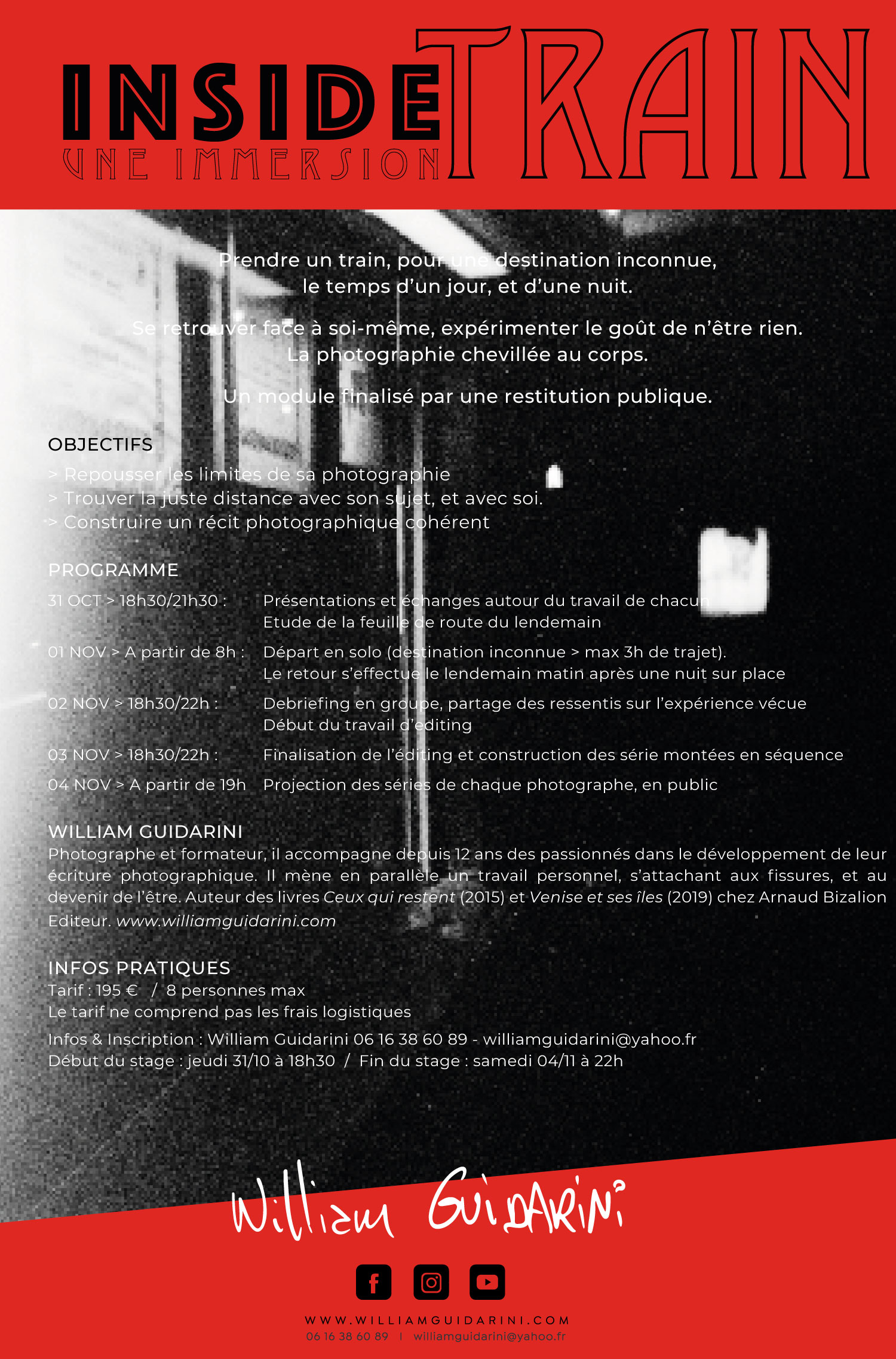 Ce module est destiné aux photographes éclairés, qui souhaitent développer un regard personnel. L’ouverture à l’autre, l’exigence et la persévérance seront les compagnons de ce voyage intérieur, pour vivre pleinement l’expérience.
