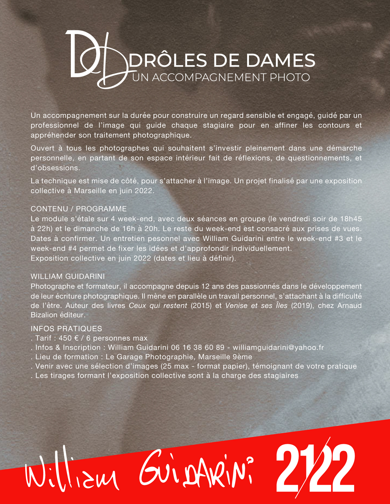 Le module Les Drôles de Dames se distingue des autres Masterclass. Chaque stagiaire est en effet guidé par William Guidarini pour affiner les contours d’un projet personnel et appréhender son traitement photographique.